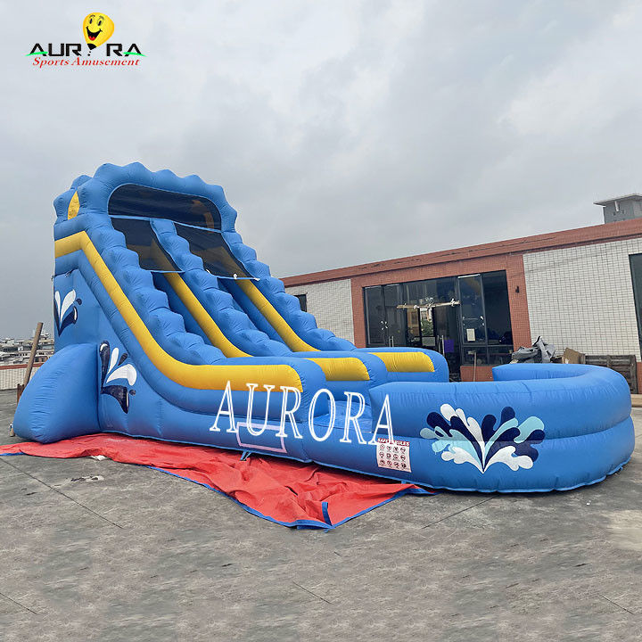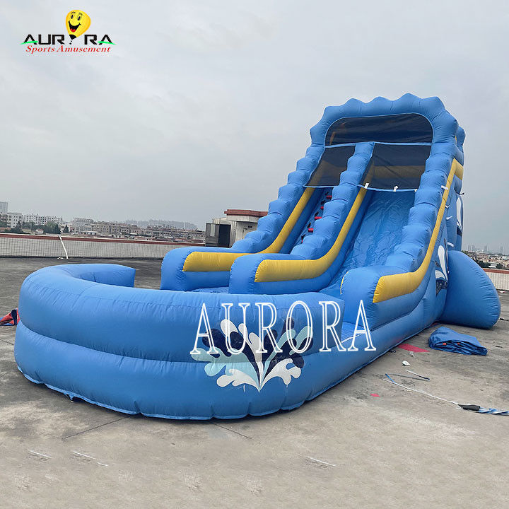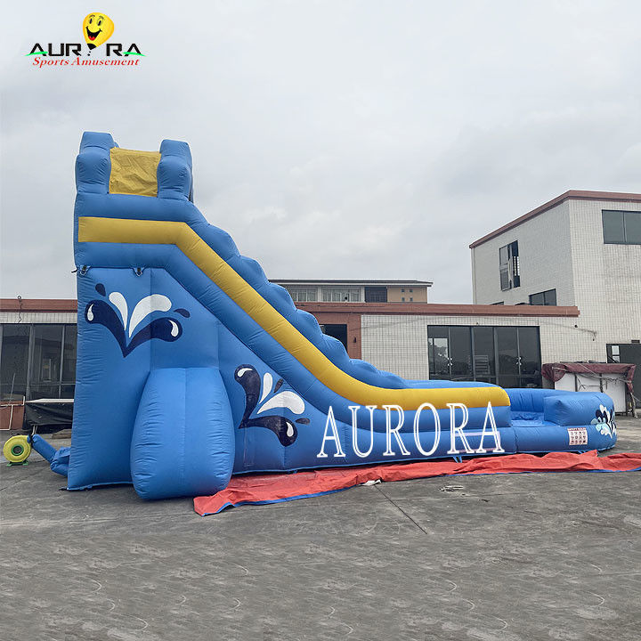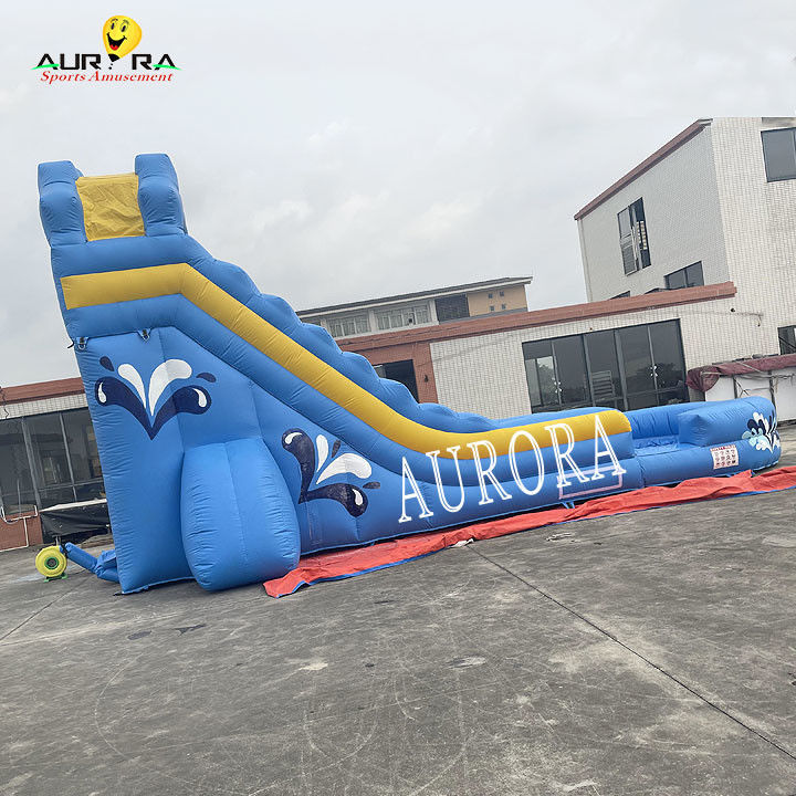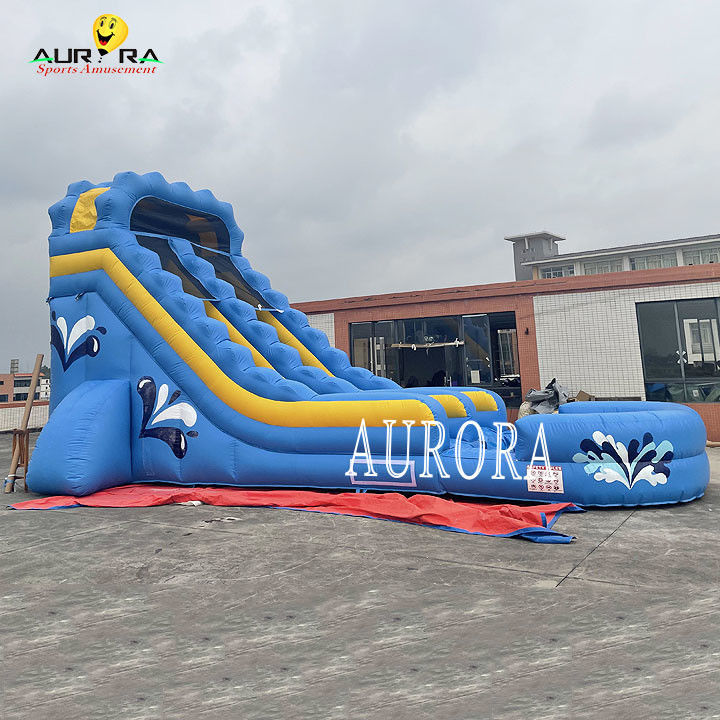 Gli scivoli gonfiabili sono una popolare struttura di divertimento con un bellissimo schema di colori blu come colore principale.resistente all'usura, e trattamento resistente ai raggi UV.